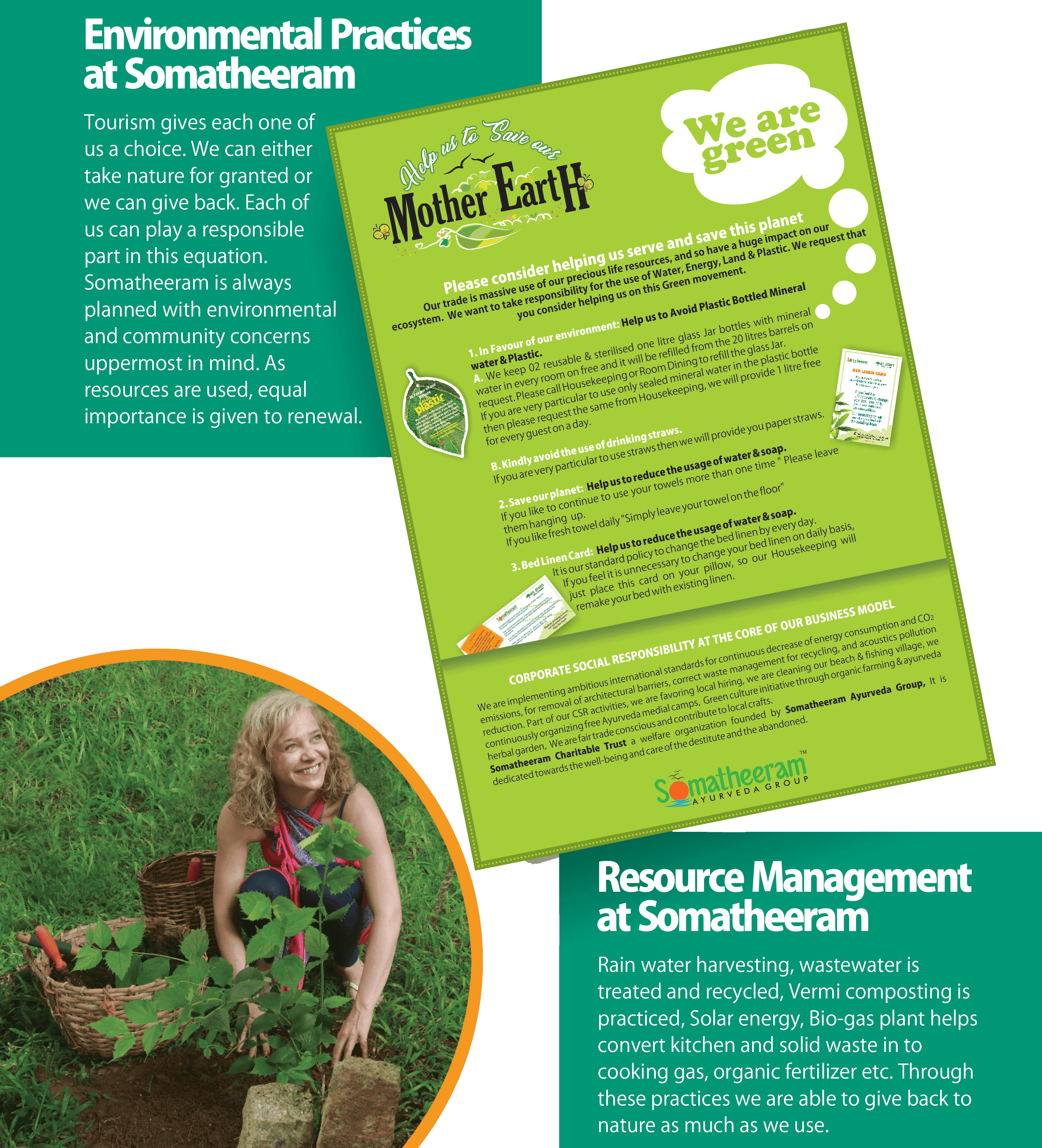 Aiming at the sources we have started many programmes to educate the local people, we have introduced organic farming, crated viable plantations and setup market mechanism such as purchasing our product from the local community etc. The use of solar energy permeates through the resorts are making them eco-friendly whilst providing a healthy Ayurvedic lifestyle, natural surroundings and modern facilities.